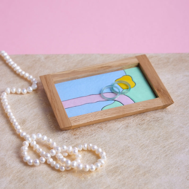 Seria dodatków do wnętrz SCENE to wyjątkowe tacki na biżuterię i inne drobne przedmioty. Kolekcja nawiązuje do obrazów - pejzaży, abstrakcji, dziecięcych rysunków. Dębowa ramka, ręcznie polerowana i olejowana, otacza mozaikę wykonaną z emaliowanej miedzi. SCENE Sweet to wesoły krajobraz utrzymany w czystych, pastelowych barwach.