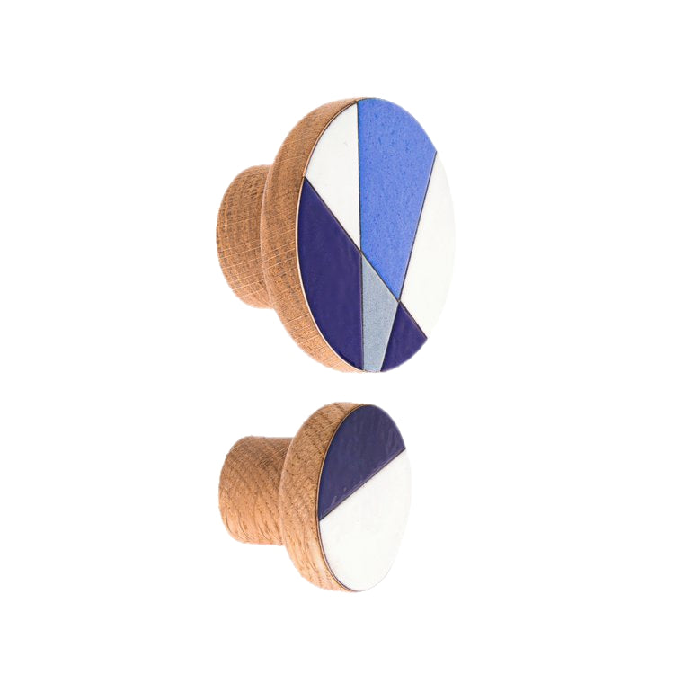 Niebieskie gałki meblowe z niesymetrycznym układem kolorów, ręcznie wykonane.