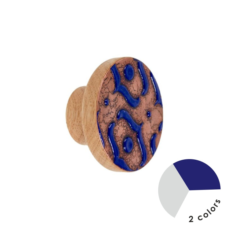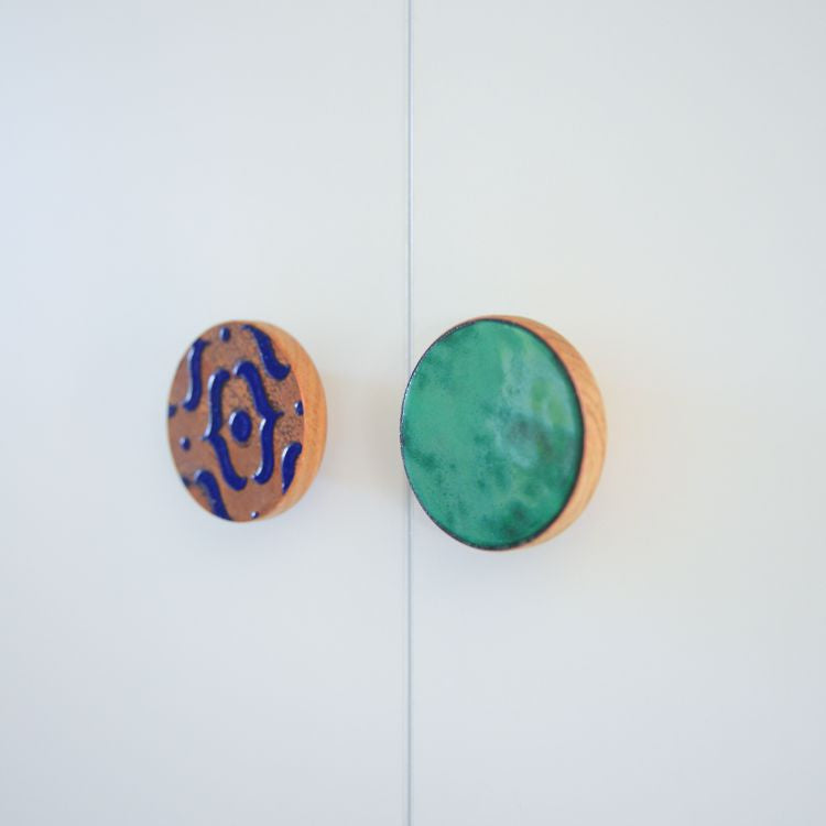 - Materiały: drewno dębowe zabezpieczone olejem twardym, emaliowana miedź
