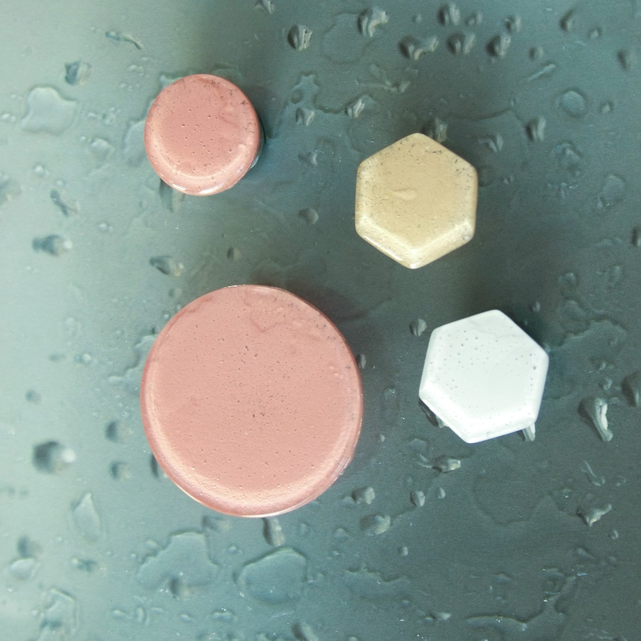 Okrągłe barwne uchwyty do kabin prysznicowych.