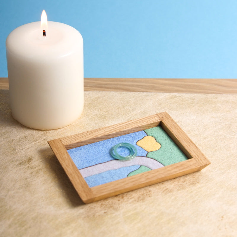 Seria dodatków do wnętrz SCENE to wyjątkowe tacki na biżuterię i inne drobne przedmioty. Kolekcja nawiązuje do obrazów - pejzaży, abstrakcji, dziecięcych rysunków. Dębowa ramka, ręcznie polerowana i olejowana, otacza mozaikę wykonaną z emaliowanej miedzi. SCENE Sweet melange to wesoły krajobraz utrzymany w melanżowych, pastelowych barwach.