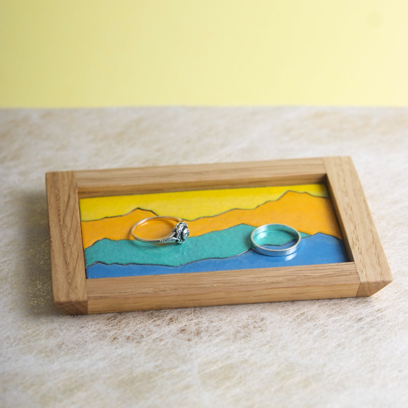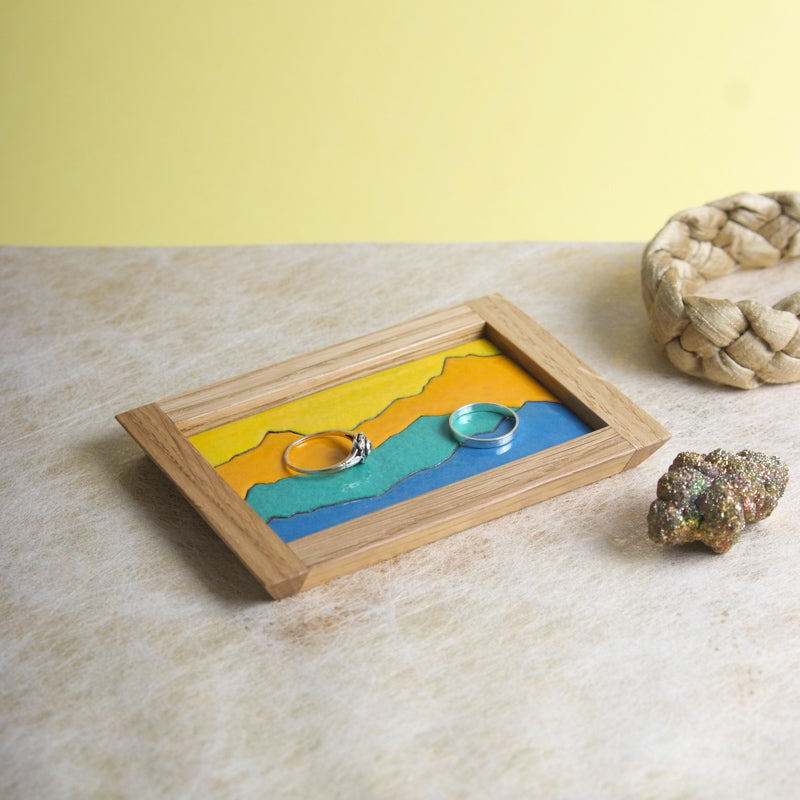 A series of interior accessoriesSCENEThese are unique trays for jewelry and other small items. The collection evokes paintings—landscapes, abstractions, and children's drawings. A hand-polished and oiled oak frame surrounds a mosaic made of enameled copper.SCENE Sunriseis a mountain landscape full of the bright colors of the rising sun.
