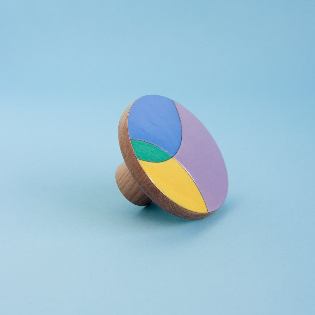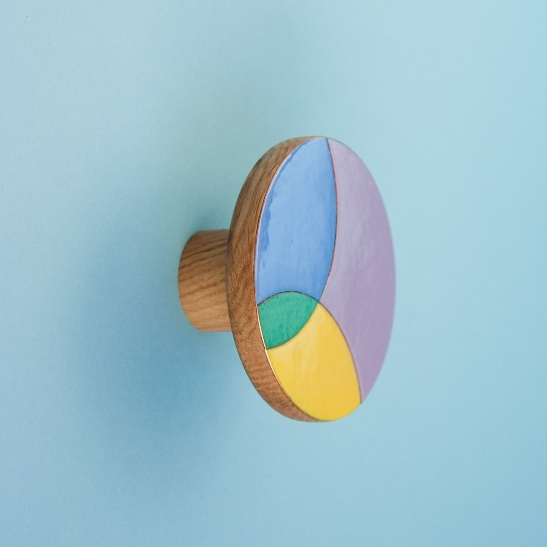 This round, multi-colored wall coat rack in vibrant, cheerful hues is a functional, eye-catching piece. The ECLIPSE coat rack features a handcrafted, colorful mosaic of enameled copper and polished, oiled oak wood, both of which are incredibly pleasant to the touch.