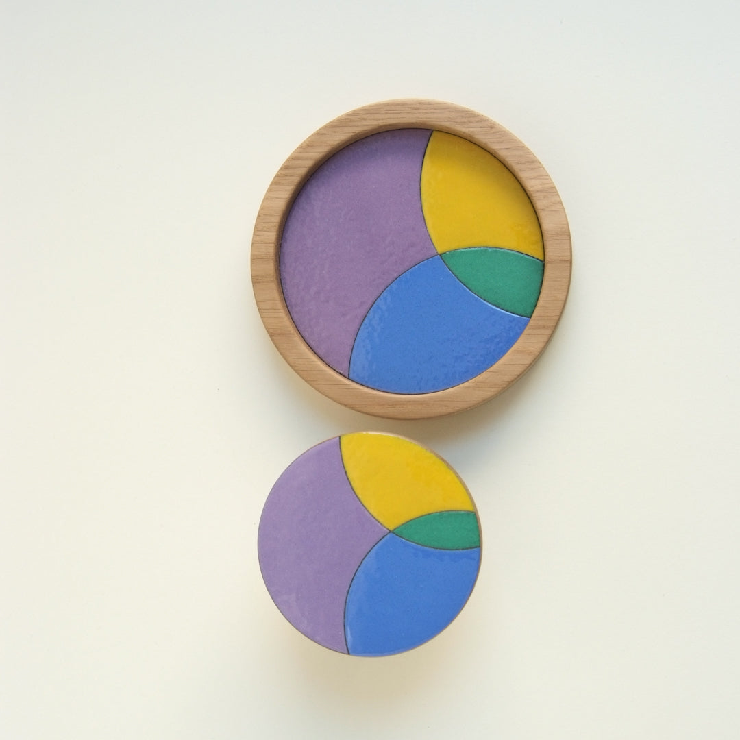 A glassy surface and beautiful colors are the hallmarks of enamel. Each mosaic fragment is fired separately, several times, at temperatures exceeding 800°C.°C. We designed the eclipse motif using four vibrant colors (purple, green, yellow, and blue) that appear to overlap and blend into each other.