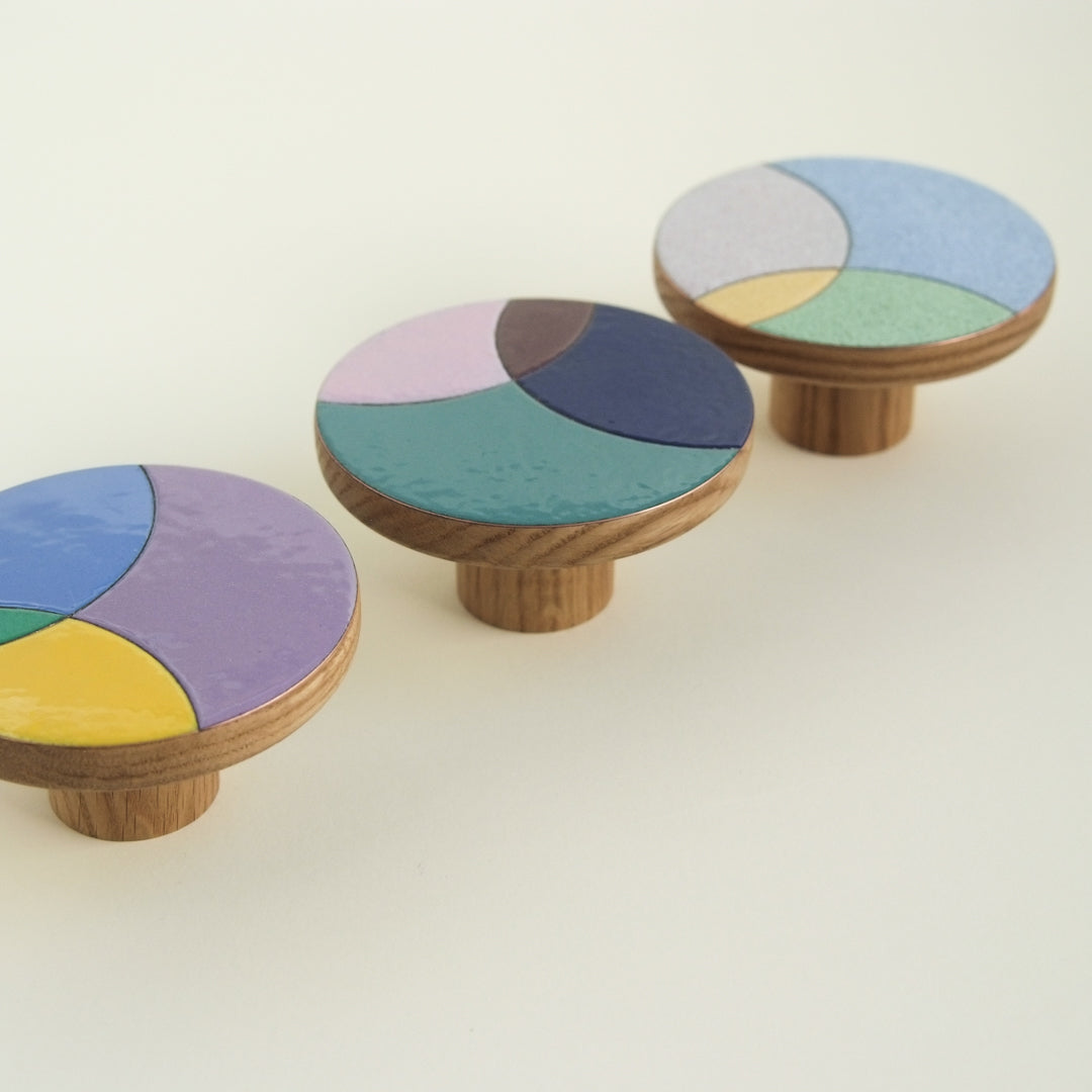 A glassy surface and beautiful colors are the hallmarks of enamel. Each mosaic fragment is fired separately, several times, at temperatures exceeding 800°C.°C. We designed the eclipse motif using four pastel colors (pink, green, yellow, and blue) that seem to overlap and blend into each other.